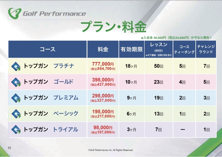 各プランにはクラブフィッティングが含まれています。